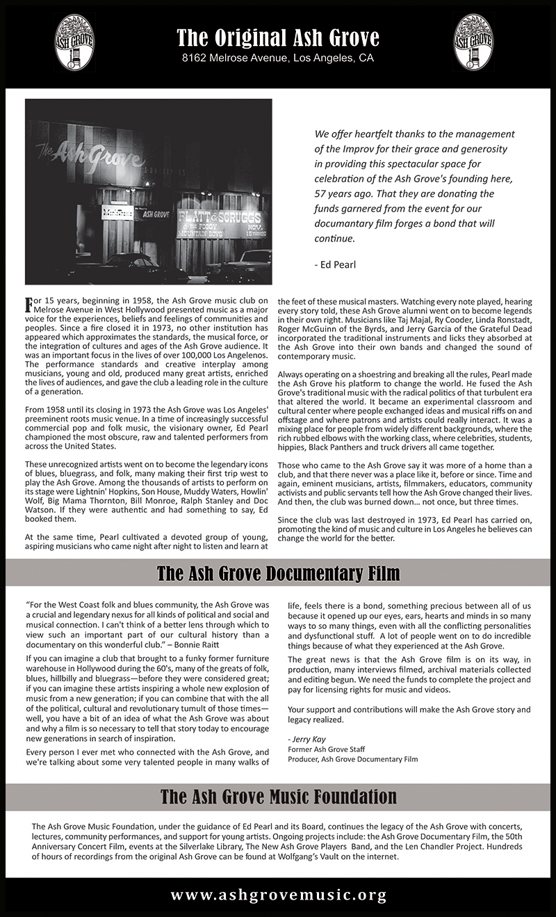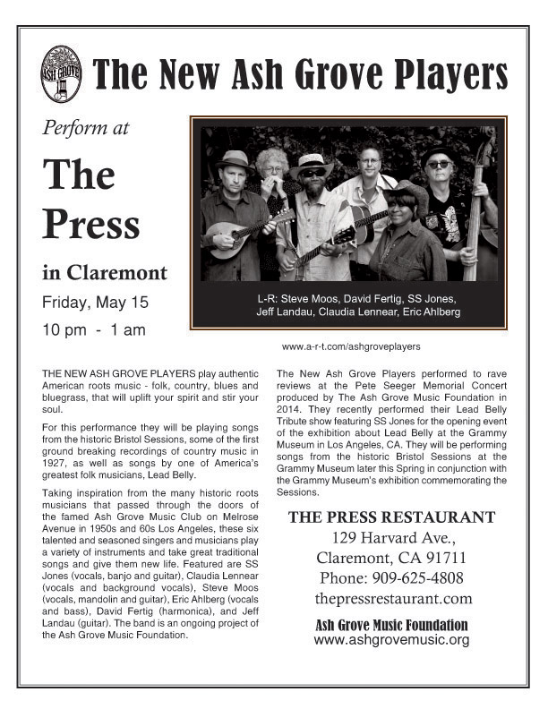 THE NEW ASH GROVE PLAYERS perform authentic American roots music - folk, country, blues and bluegrass that will uplift your spirit and stir your soul. Taking inspiration from the many historic roots musicians that passed through the doors of the famed Ash Grove Music Club on Melrose Avenue in 1950s and 60s Los Angeles, these six talented and seasoned singers and musicians play a variety of instruments and take great traditional songs and give them new life. Featured are SS Jones (vocals, banjo and guitar), Claudia Lennear (vocals and background vocals), Steve Moos (vocals, mandolin and guitar), Eric Ahlberg (vocals and bass), David Fertig (harmonica), Jeff Landau (guitar) and Stewart Niemi (dobro). The band is an ongoing project of the Ash Grove Music Foundation. |