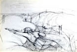Yet already in early sketches—here we return to them—we find White warming up for what is soon to become a more naturalistic means to represent the figure. “Working Man” (c. 1938–1942) and “The Soldier” (1940) share something of the awkwardness of youthful experimentation with the line, but they are an important indication that the artist has something other in store—something more personal, spontaneous and lyrical—than the conventions of Social Realism. This is still more clear in the surprisingly early “Boy with Accordion” (1939), a charcoal drawing on paper that foreshadows what becomes White’s chief preoccupation in the early 1950s. Now resettled in New York, he throws himself into a great period of production, thriving socially in the company of a new circle of creative friends (Harry Belafonte and Sidney Poitier prominent amongst them) and in the start of his intense, liberating love affair with Fran. It is at this time that he leaves all but the fundamental lessons of Social Realism behind in favor of images where naturalistically-styled, volumetric portrayal blends with sketched, linear background information that gives context to the figure. In his personal passion for the African American musical traditions of gospel, soul and jazz, White finds around this time a more intimate means to put his artistic skills to work while still in the service of his unchanging goal to speak to others of the depth and richness of the black experience. The drawings that resulted appeared in such venues as record album covers, magazines and film credits. In the present collection, the painting “Gospel Singers” (1951)(see cover) best represents both the artist’s mood and his changing, now more lyrical style. His heroes now are artists of all kinds, those who bring their voices and their skills to the common cause of raising both consciousness and community pride.