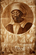 Contemporaneous with the “Wanted Poster” series, or shortly in their wake, came a number of comparable works that in their impressive scale as well as their technical mastery and seriousness of purpose must count amongst White’s most mature and authoritative accomplishments. They celebrate historical and cultural heroes from the days of slavery through the twentieth century: Harriet Tubman, Frederick Douglass, the “Black Founding Fathers” Paul Cuffee and Richard Allen, the influential social historian W.E.B. Dubois and others. They further celebrate the contributions of the less well known, the anonymous “Black Worker,” as well as of black financiers and businessmen. They do this, each of them, in the context of the slave ancestors recalled by the recurring back-ground image of that folded document of indenture, acknow- ledging the debt to those who suffered in the early years. In “The Black Worker” (1974), this debt becomes explicit in the profile set eerily behind the capped head of this twentieth-century workman, whose haunted, if determined gaze looks out with quiet defiance into the world.