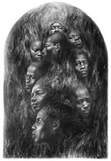 If these works are White’s major contribution to the epic struggle for African American recognition and social equality, some of the latest works—“Love Letter lll” (1977), “Sound of Silence” (1978)—are amongst the most lyrical and self-assuredly serene of the artist’s entire opus. “I Have a Dream,” the lithograph commissioned by the Los Angeles County Museum of Art for its groundbreaking 1976 exhibition, “Two Centuries of Black Art, 1750–1950,” takes its title from the historic speech of Dr. Martin Luther King that gave public voice to all the passion and energy of the surging civil rights movement. White’s image, though, is emotional on the intimate scale; alternatively titled “Madonna and Child,” it celebrates the heroic role of the black woman and mother in the struggle for freedom—a recurring theme in White’s work—and the hope represented by the child she tenderly carries in her arms. Head tilted heavenward, her lovely face highlighted and her eyes half-closed as if in prayer, she seems to offer her child to the future with a generosity of spirit and a purity of intention that invoke the freedom yet to be achieved.