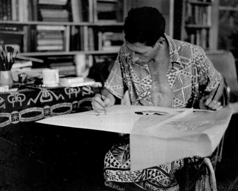 In the history of the Aloha Shirt, there has been no more innovative merchandiser nor better self-promoter than “Keoni of Hawaii.” John “Keoni” Meigs (“Keoni” is Hawaiian for John) was a self-taught painter whose talent became known to the early shirt manufacturers in Honolulu. In 1938, he created his first designs, concentrating on Polynesian tapa patterns inspired by the originals he had studied at the local Bishop Museum.